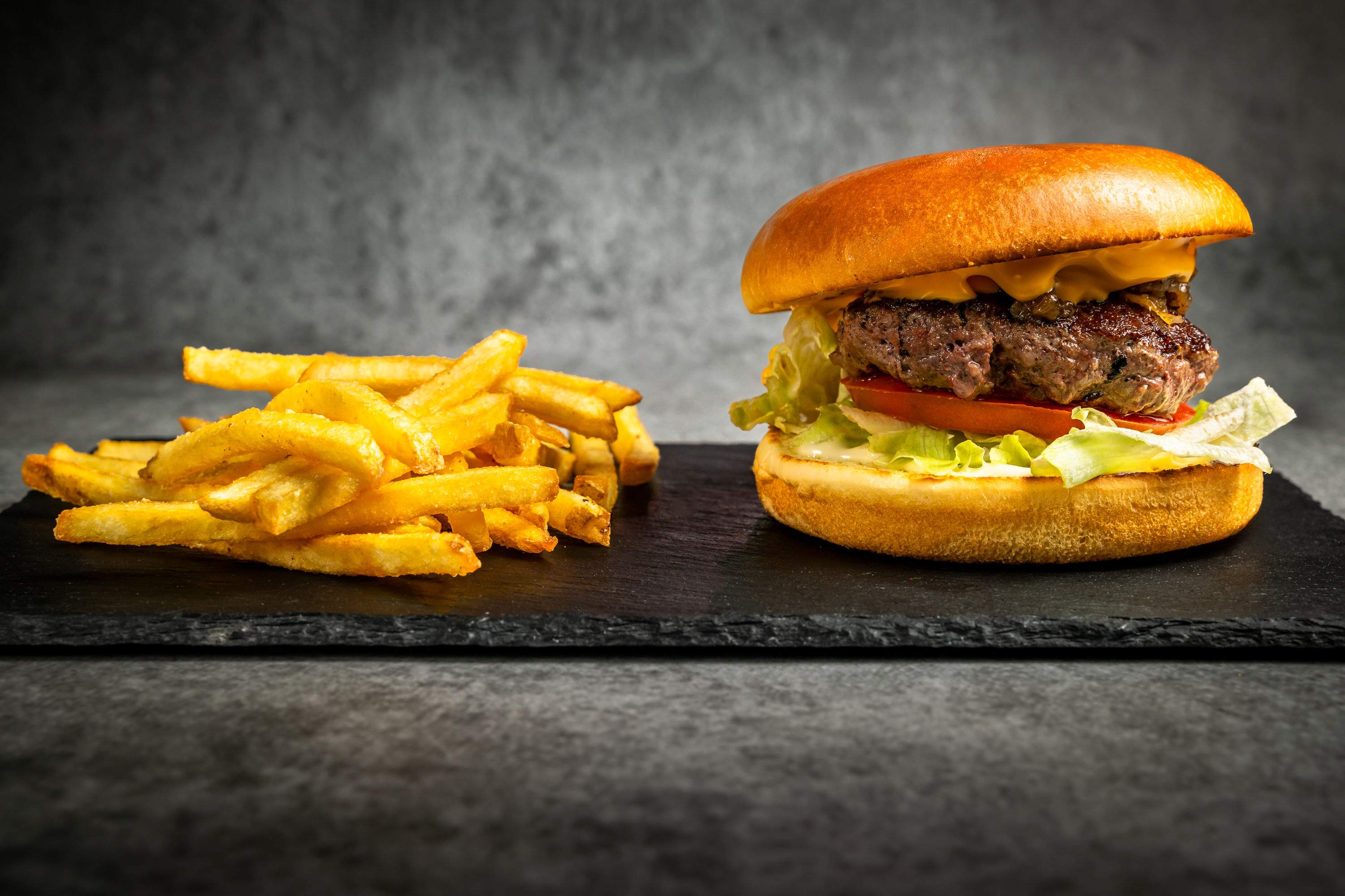 Говежди бургер Блек Ангъс по оригинална рецепта, поднесен с бриош и картофки